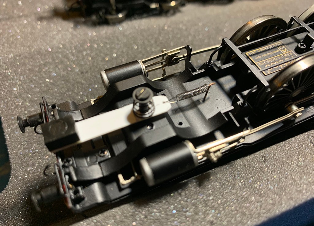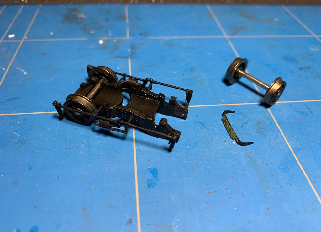 Nadat de koppelbomen zwart waren gespoten zijn zij samen met de bogie en veer weer gemonteerd. Ik heb helaas geen foto van het eindmodel, want dat ben ik simpelweg vergeten. Het verschilt echter niet veel van het styreen moedermodel, alleen dan is het zwart gespoten messing. De voorzijde heb ik daar nog iets schuin afgevijld zodat de bovenzijde mooi achter/onder de handgrepen onder de bufferstelen draait en niet blijft haken.