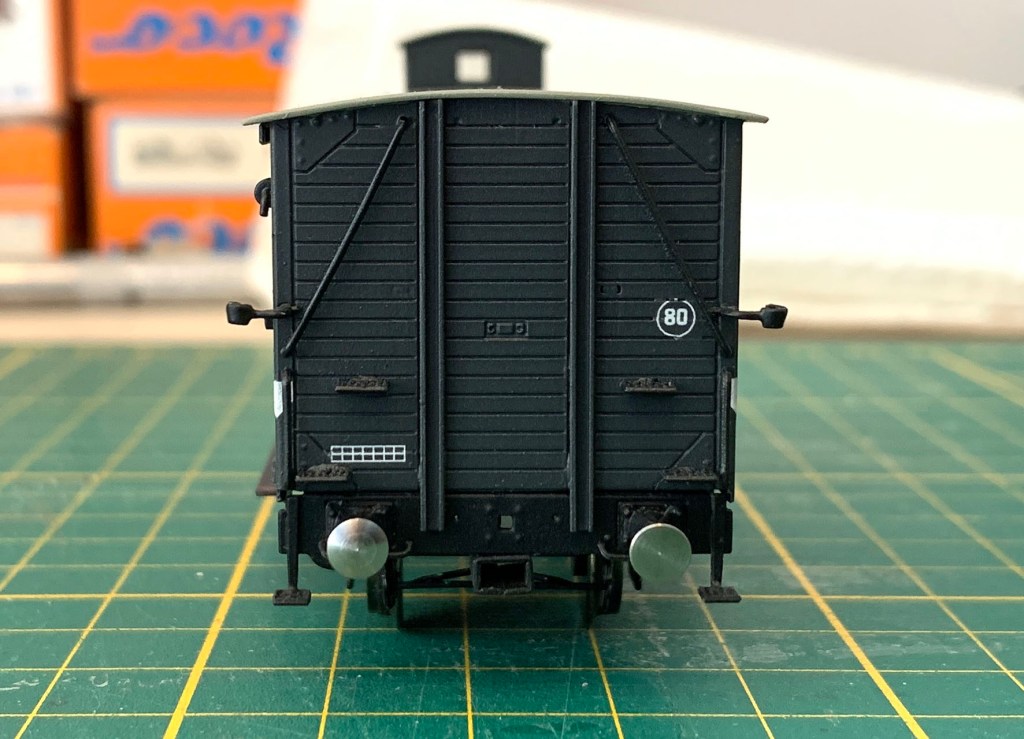 Het eerste wagentje betrof de veewagen met remmershuis. De wagen heeft verende buffers gekregen en een gegoten Westinghouse remsysteem van Philotrain/Phildie. Deze is aangesloten op remspindel en driehoeken tussen de remschoenen. Omdat het oude wagens zijn heb ik ervoor gekozen om een oud model buffers erop te plaatsen.