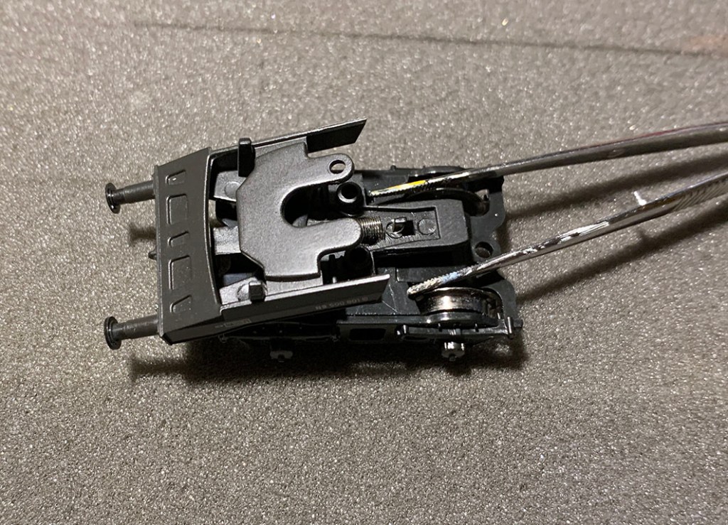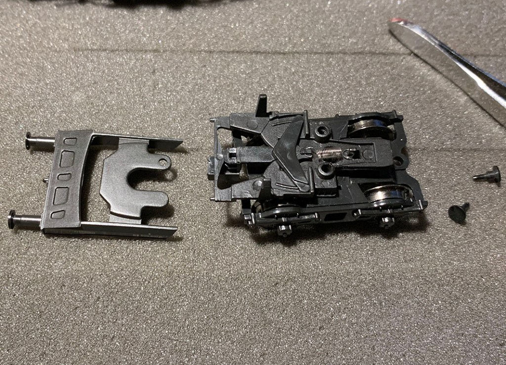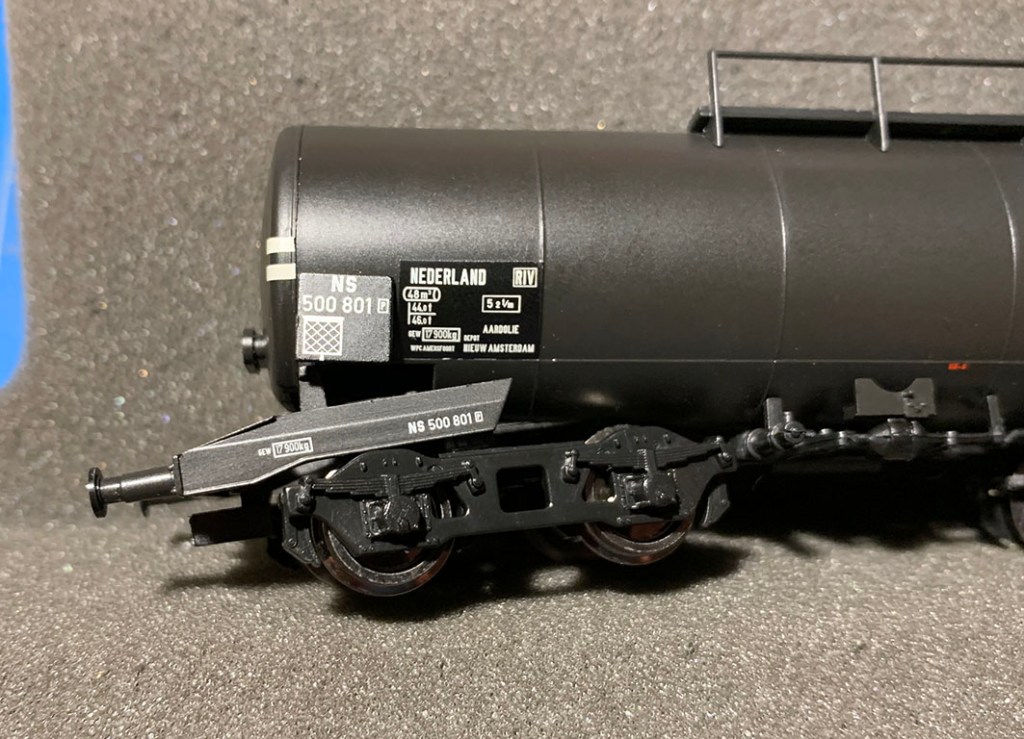 Beide onderstellen kunnen voorzichtig los geklikt worden door de zijde van de bufferbalk naar beneden te trekken. Voordat je dat doet moeten bij het bordes eerst twee handgrepen uit het frame gehaald worden. Daarna kan deze diagonaal uit de ketelwagen geschoven worden. Wanneer beide onderstellen los zijn moet het frame los van het onderstel gehaald worden. Dit kan door het schroefje los te draaien en daarna het frame er voorzichtig af te halen. Let op! Het hekwerk op de ketel en het leidingwerk zijn fragiel. Pas op dat dit niet breekt.