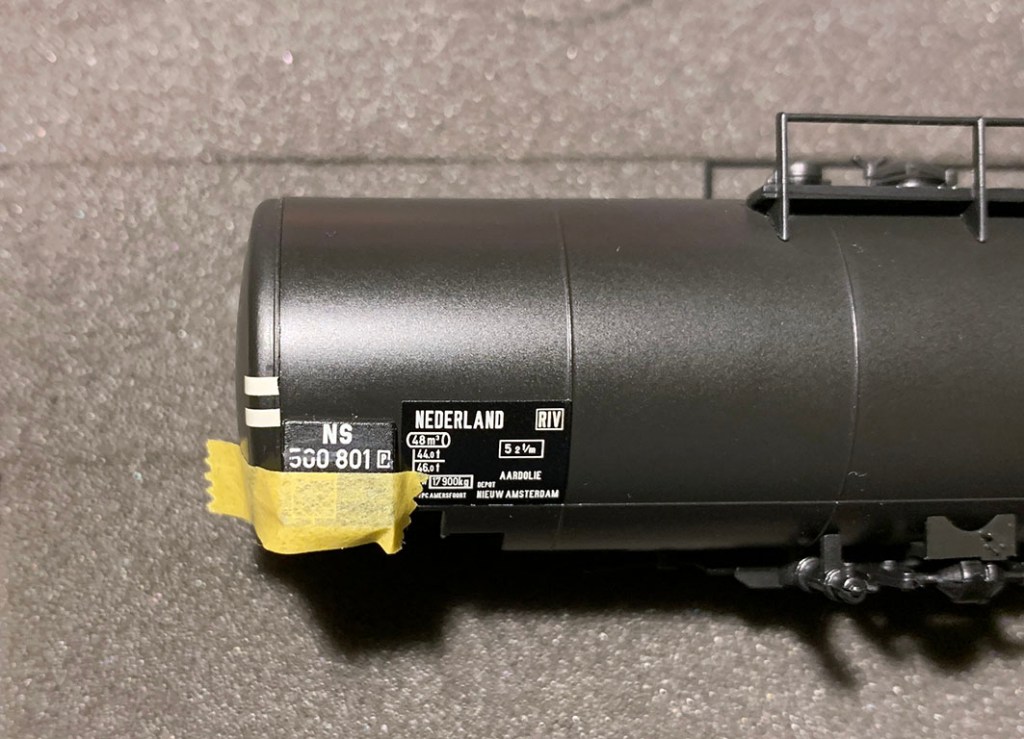 Nu kunnen de bestaande nummers weggehaald worden. Met een stukje schuurpapier korrel 2000(!) worden de letters zachtjes weggeschuurd. Maak het schuurpapier nat voor een gladder resultaat. Alleen de nummers die vervangen worden gaan weg, de rest blijft zitten. Op de plaat op de ketel is het daarom slim om het raster onder het nummer af te plakken, dan kan dit tijdens het schuren niet beschadigen. Ontvet nu eerst alle delen met een lauwwarm sopje met Dreft voordat de decals erop gaan.