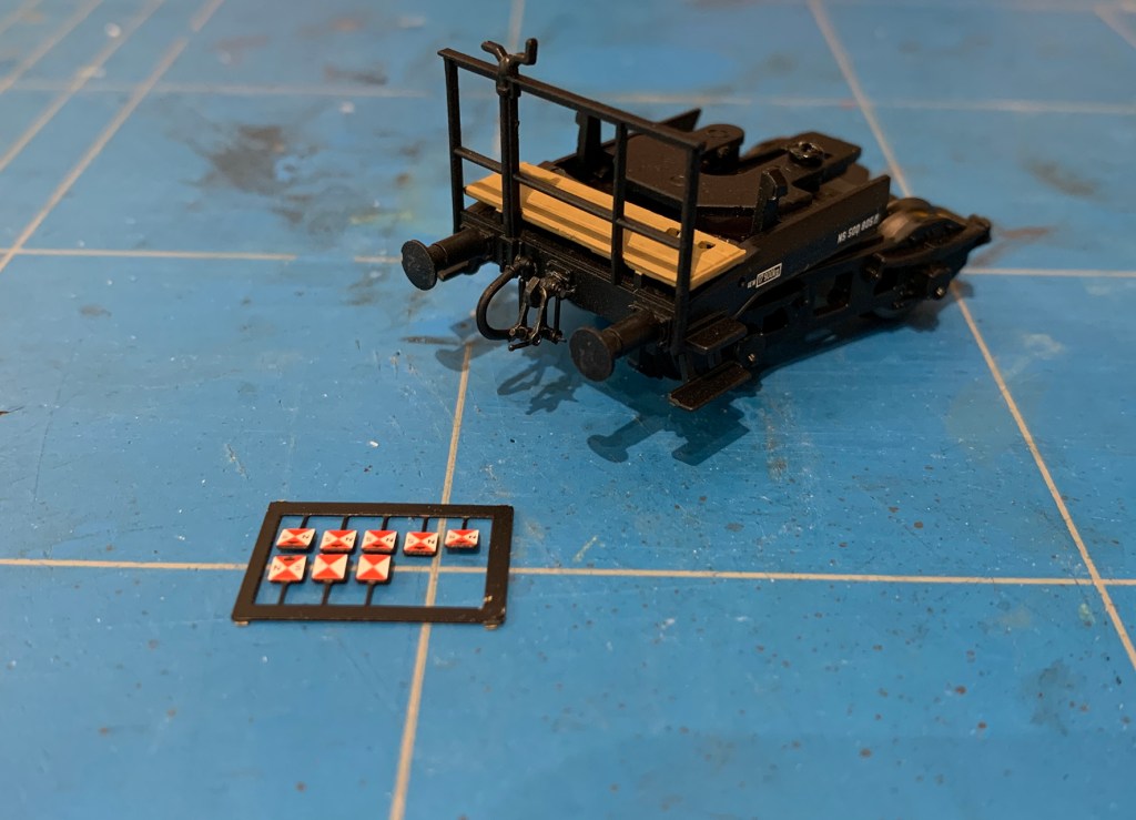 De sluitborden komen van Artitec. Helaas momenteel niet leverbaar maar ik had jaren geleden een setje aangeschaft. In mijn planning staat een oplage voor MCKmodelbouw. Ik heb de dunne plastic seinhouders weggesneden want ik zag het niet zitten om daar een gaatje in te boren. Het eerste rechthoekige gedeelte aan de ketel heb ik laten zitten. Daar heb ik met een boortje 0,5mm een gaatje doorheen geboord. Uit restanten van zandwagen etsplaatjes had ik nog sluitseinijzers over en die heb ik erin gestoken en vastgezet met een klein beetje secondelijm. Daarna met zwart aangezet. Toen de verf droog was de sluitseinborden van Artitec erin gestoken en gefixeerd met een minimale hoeveelheid crystal clear.