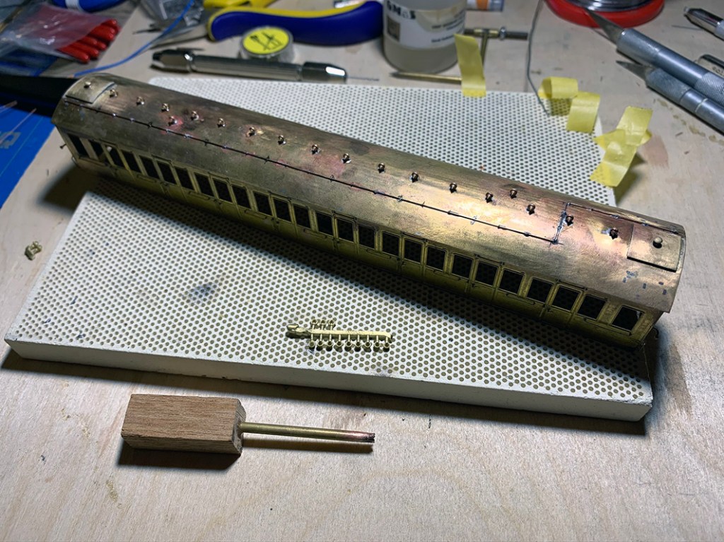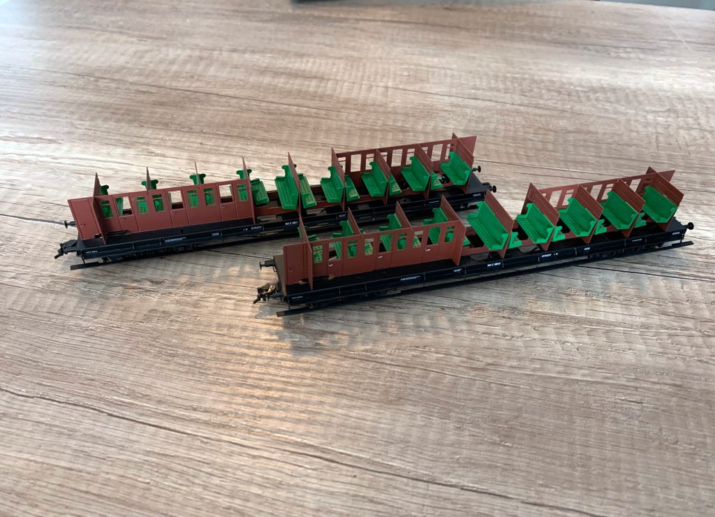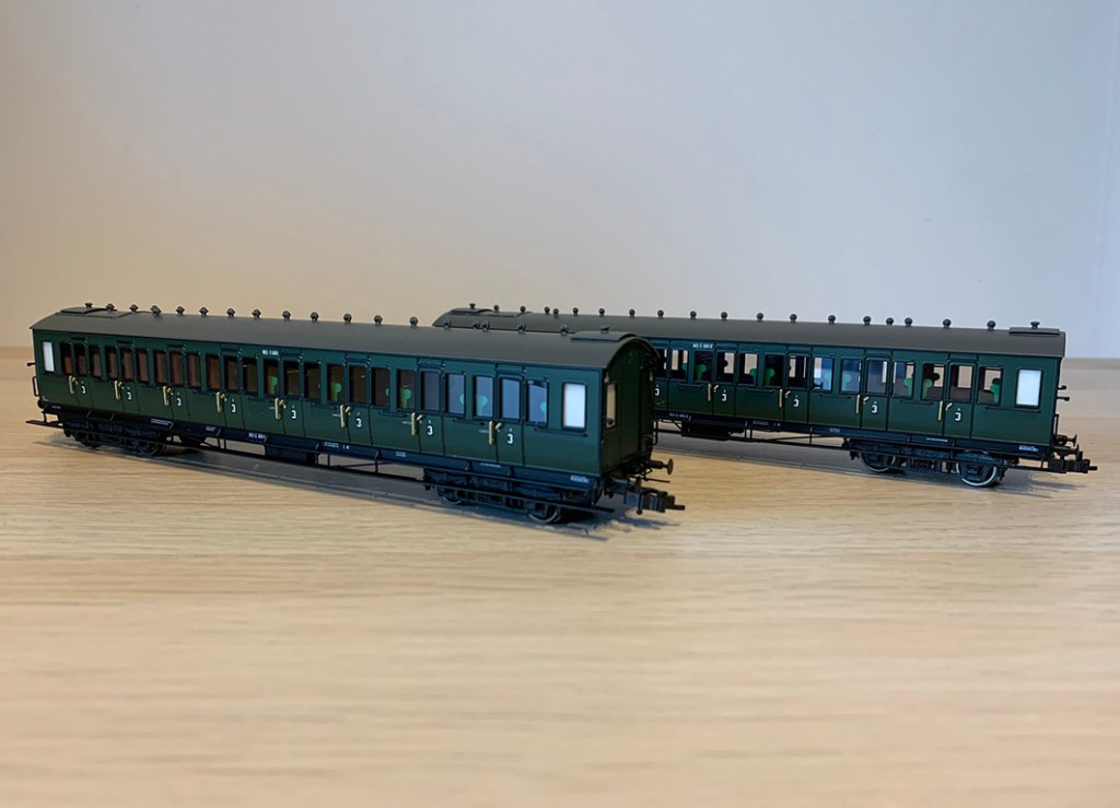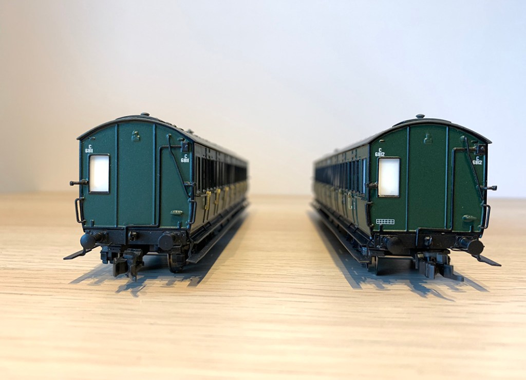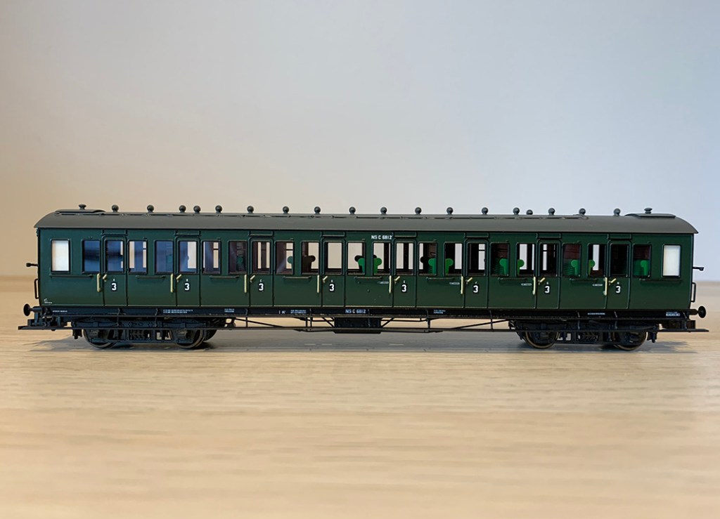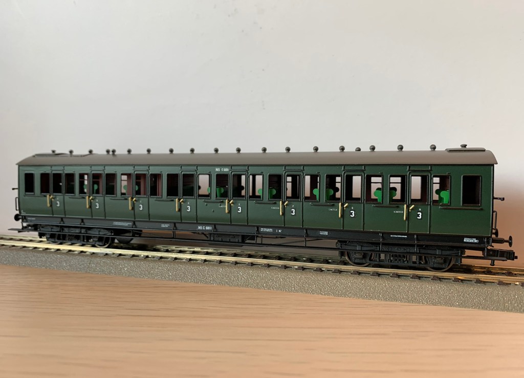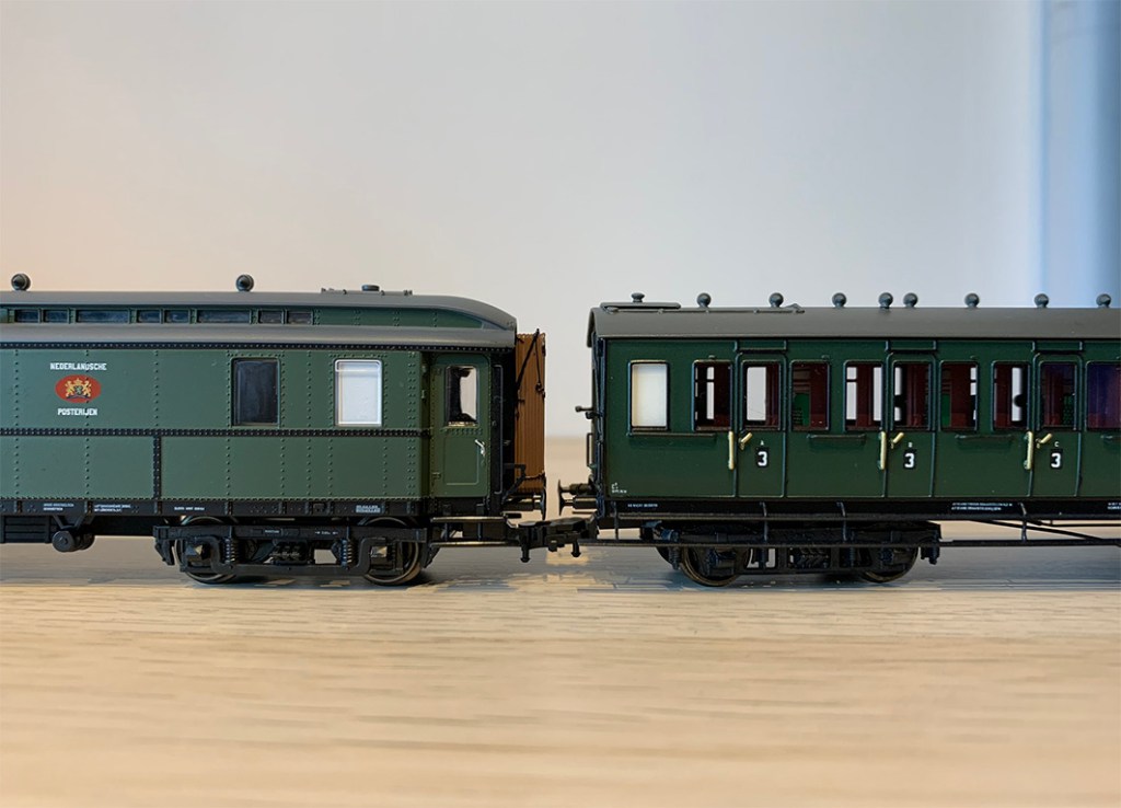De rijtuigen zijn gebouwd uit een kit van Seinarm.nl. Een fijne etsplaat om te bouwen. Op het dak is een dakleiding gemaakt op basis van twee oude foto’s. Doordat er maar drie rijtuigen bestonden zijn er bijna geen foto’s van te vinden. Veel is daarom op gevoel gedaan.