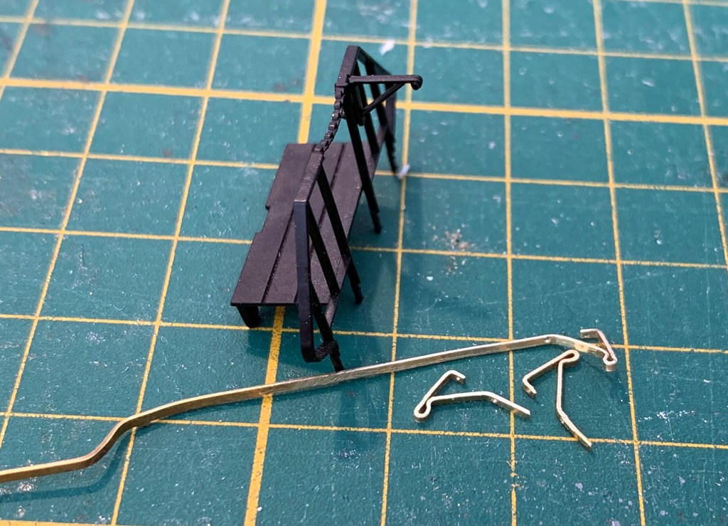 De hoge kopwand krijgt ook sluitseijnijzers en handgrepen. De oude aangegoten handgrepen zijn weggesneden en op maat gemaakte handgrepen worden geplaatst. Deze zijn gebogen uit fosforbrons draad. Hier is gekozen voor 0,5mm. Meestal is dit te dik, maar in dit geval past het beter bij het kunststof Fleischmann bordes. 0,35mm is natuurlijk ook mogelijk.