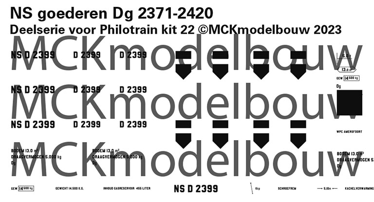 Voor het afbouwen van Philotrain kit nummer 22 zijn opschriften getekend. De opschriften in de Philotrain kit zijn vaak broos door ouderdom en kunnen niet mooi geplaatst worden. Het velletje opschriften bied hier uitkomst voor. Bovendien staan er meer opschriften op dan bij Philotrain zelf. Door de tijd heen hebben de Dg’s de ouderwetse gegevens op de zijwand en de moderne gegevens met pictogrammen gehad. Beide versies zitten op de print, waarvan slechts één versie geplaatst hoeft te worden. Op het opschriftenvel staat slechts één wagennummer: Dg 2399. Op speciaal verzoek kan er op termijn een ander nummer geprint worden. Geef dit alstublieft aan per mail.